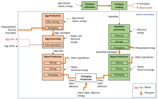 System boundary of vegan (in green) and egg (in red) mayonnaise production, from cradle to factory gate.