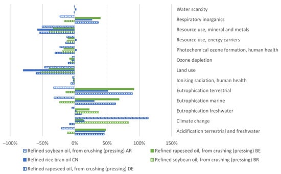 Comparative environmental footprint of vegan mayonnaise made with Argentinian sunflower oil from pressing (reference, on Y axis at 0%), and from vegan mayonnaise made with soybean oil (Brazil—BR and Argentina—AR), rice bran oil (China—CN), and rapeseed oil (Belgium—BE and Germany—DE) across the non-toxicity categories recommended by the Product Environmental Footprint guidelines.