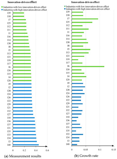 Measurement results of innovation driven-effect for 40 industries from 2005 to 2016. (a) Measurement results; (b) Growth rate.