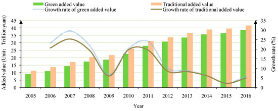 As presented in Figure 2, the proportion of the green added value in the traditionally added value increased from 79.54% in 2005 to 92.25% in 2016, which indicates that China’s economic development mode has been optimized. Besides, with the implementation of environmental policies, the environmental cost was reduced year by year. This reduction in cost ultimately made the average growth rate (14.46%) of green added value higher than that of the traditionally added value (12.81%).