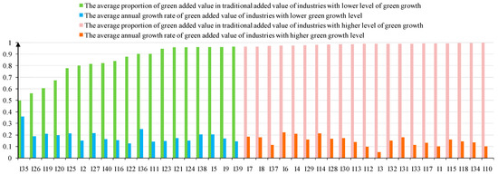 To explore the industrial disparities of green added value, we classified 40 industries into two categories based on the proportion of green added value in the traditionally added value: one contains the industries with lower than the average proportion (we also call these as the industries with a lower level of green growth), and the other contains the industries with higher than the average proportion (we also call these as the industries with a higher level of green growth). As illustrated in Figure 3, the growth rate of green added value for the industries in the first category (18.26%) is higher than that in the second category (14.51%). This is because the higher the levels of green growth, the less space for abatement, so the average growth rate of industries in the first category is lower than that in the second category. In the first category, electric power production and distribution was the industry with the highest average growth rate at 35.85%, while chemical fiber manufacturing was the industry with the lowest average growth rate at 12.48%. Nonmetal ores mining and processing was the industry with the highest growth rate at 22.07% in the second category, while tobacco manufacturing was the industry with the lowest growth rate at 9.82%.