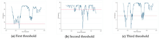 The traditional method to explore these nonlinear characteristics is to set a division standard (that is, threshold) subjectively by researchers, then divide the sample into several parts according to the division standard and carry out piecewise regression. However, this traditional method needs to set the threshold subjectively, which means that this method can neither estimate the threshold parameters nor test the significance of the threshold statistically, so it lacks reliability [50]. Hansen [51] proposed the threshold regression model in 1999. This model overcomes the limitations of traditional methods: On the one hand, this model does not need to assume the form of a nonlinear equation, and the threshold value and number are determined by the sample data endogenously, which overcomes the influence of subjectivity. On the other hand, this model estimates the threshold parameters through statistical inference and adopts the bootstrap method to test the significance of the threshold. So, this model is frequently used to explore the nonlinear influence of a variable on other variables [52]. As noted above, we selected a threshold regression model to examine the mechanism of driving green growth and decreasing energy security risks by innovation.