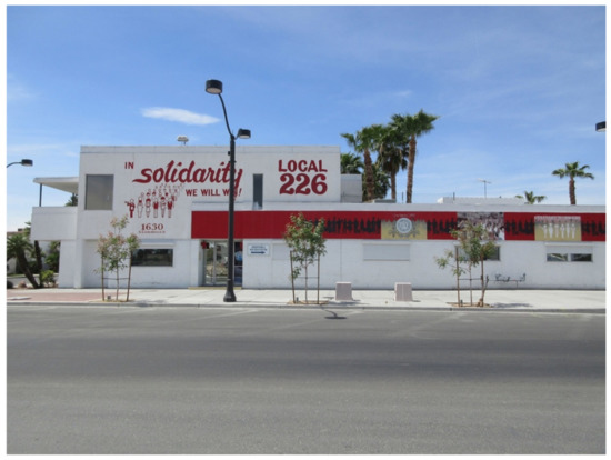 Another spatial aspect of unions as urbanists is the relationship with formal planning and development in Las Vegas. The Culinary Union directly intervenes with the growth of the urban form when they feel that an injustice will take place against workers in the operations of a development. For example, the new City Hall building was staunchly opposed by the Culinary Union, who viewed it as a mismanagement of public funds towards a project that neither consulted the public nor guaranteed living wage salaries and unionized benefits. Chris Bohner, the Culinary Union’s research director, told the City Council of Las Vegas that “it was irresponsible to pursue a new city hall building when the city is cutting its budget to make ends meet and seeking to revisit union contracts to slow the growth of personnel spending” cited in [27]. The union engaged in several types of urban practices, such as protests and a lawsuit. Consequently, in 2009, the union and the City of Las Vegas reached an agreement related to the Union’s involvement in development projects. The memorandum of understanding stated that gambling-related hospitality projects where there are public financial and proprietary interests must seek an agreement with an appropriate union. In return, the union agreed to refrain from opposing new projects in the redevelopment area and stay neutral on redevelopment-related state legislation. They also agreed to create a citizens advisory committee for the city’s Redevelopment Agency, to focus future redevelopment on neighborhoods at risk of decay, and to conduct a living-wage study [28,29,30].