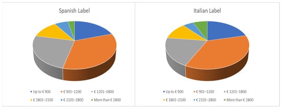 Once the collected questionnaires had been analyzed and refined, the final sample comprised a total of 146 participants: 75 consumers carried out the EVOO tasting with a label identifying the product as Spanish, while 71 participants tasted the product identified as of Italian origin. A Chi-square test was conducted to determine whether the demographic and socio–economic characteristics of the two samples were stable in terms of certain demographic characteristics and whether the student sample would be deemed suitable for this research. If the sample had homogeneous subgroups, then it would be stable in terms of certain demographic characteristics. Given that the gender variable was controlled in the design of the experiment, the distribution of samples among subsets indicated no conspicuous biases regarding participants’ gender [χ2 (1) = 0.006, p = 0.938 > 0.01]. In the Spanish-label group, the gender ratio of the participants was 36.0% male to 64.0% female, while the sample for the Italian label was 63.4% female and 36.6% male. Another sociodemographic variable that has been shown to have a significant effect on CE is income level [13,24,81,86,111]. The composition of both groups by income level presented quite similar results (see Figure 2), and the Chi-square test confirmed no conspicuous biases [χ2 (1) = 1.322, p =0.933 > 0.01].