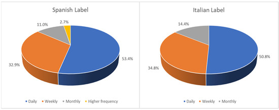 Another variable of interest is the frequency of consumption. The results were grouped according to daily, weekly, monthly, or higher-frequency consumption. The results achieved (see Figure 3) also showed homogeneity between both groups [χ2 (1) = 2.807, p = 0.833 > 0.01] regarding the frequency of consumption and, therefore, the knowledge of the EVOO. In both groups, more than 85% of the sample indicated consuming EVOO on a daily or weekly basis.