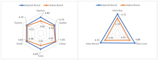 First, the measured ratings of each of the variables related to EVOO Quality Attributes and Behavioral Intention according to the COO label were analyzed. As can be seen in Figure 4, the results show that the EVOO with Spanish label is better valued in all the characteristics studied. In the case of Quality Attributes, the descriptive results show that the differences in the items “General Opinion” and “Taste” are more important than in the rest of the variables. The mean values in the variables related to Behavioral Intention are higher in the case of the sample of EVOO with a Spanish label than in EVOO with an Italian label.