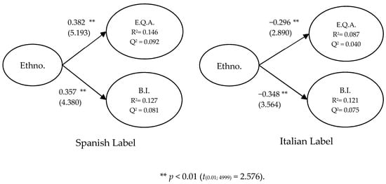 The results of the structural model allow confirmation of H1 and H2, since significant and positive relationships are found between the ethnocentrism identified in young consumers and both the assessment of the attributes of the EVOO (β = 0.382, p < 0.001) and Behavioral Intention (β = 0.357, p < 0.001) for EVOO with the Spanish label. The results for EVOO with the Italian label reach significant values but, in this case, inversely. Although the level of explanation is not very high (R2 = 0.087), the CE achieves a significantly negative effect on the Quality Attributes perceived for Italian EVOO. More importantly, in the case of consumer behavioral intention, the level of explanation and effect size is very similar to that reached by the Spanish label but in a negative sense (β = −0.348, p < 0.001). Therefore, CE has an inverse effect on the intention to buy Italian EVOO. Additionally, to complete the validation of both models, Stone–Geisser’s predictive relevance (Q2) was developed. The results (see Figure 5) show that all values are positive, indicating that the model has predictive capacity for the estimation of values.