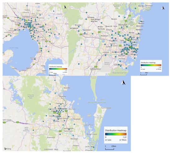 Example geographic distribution of respondents within major cities: Melbourne (top left), Sydney (top right) and Brisbane (bottom).