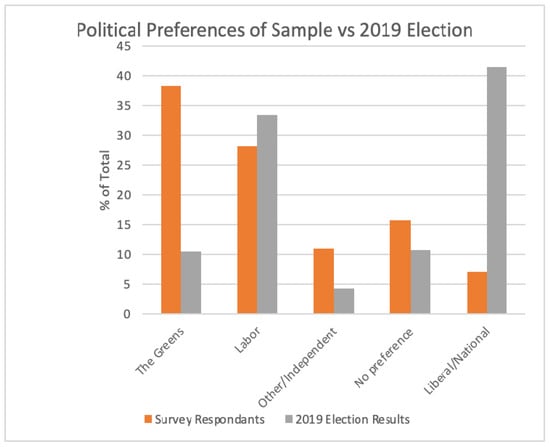 Our survey over-represented Greens and Independent voters and under-represented Liberal/National voters (Figure 4). Respondents were almost six times less likely to support the Liberal-National Party (LNP) than Australians voting in the previous election. This may be a reflection of the greater interest in planning in general among Labor, Greens, and independent voters, or the audience of the mailing list and media publications that the survey was sent out through.