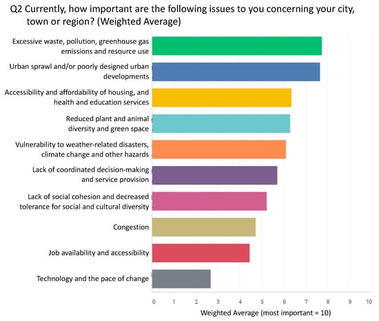 While there was variation in responses, it is possible to summarise, from the analysis in Section 3, a very strong overall narrative. The respondents’ priority issues in their future urban visions, as summarised above, are supported by several other research studies. Australian cities create a considerable amount of pollution, waste and greenhouse gas emissions [37,38]. Therefore, planning cities in a way that limits these outputs is an important consideration. However, it might be considered surprising that sustainable resource use was ranked so highly by citizens, as it could be seen as having a less immediate and direct impact on people’s daily lives than other factors. Possibly, this cohort is more attuned to or interested in such issues than the overall public. While Australian cities have ambitious goals for reducing waste and emissions, they have achieved limited shifts towards a circular and pollution-free economy in practice. Within our sample, it was seen as the most critical pathway towards creating ideal future cities, and certainly, there is significant potential for improvements in waste and emissions management in Australian cities to develop a more circular economy.