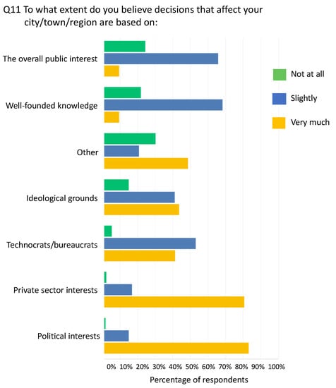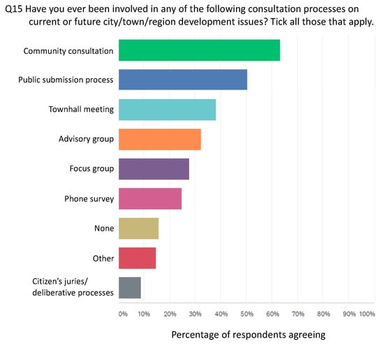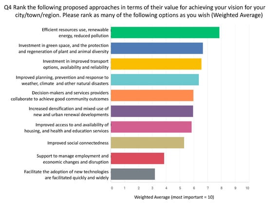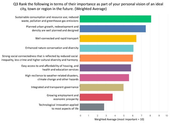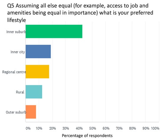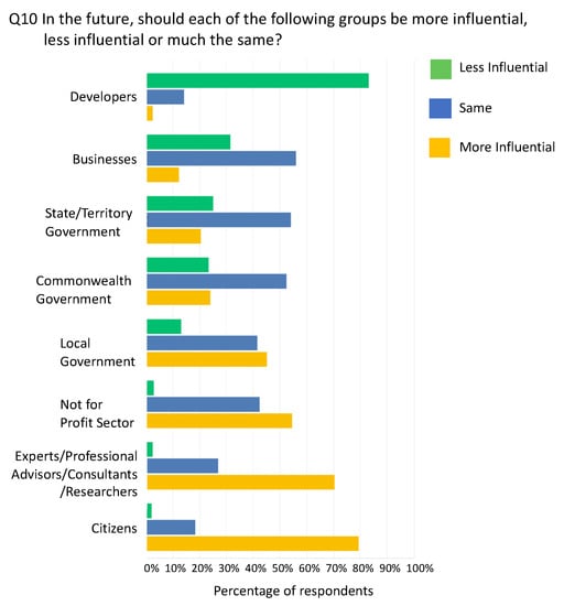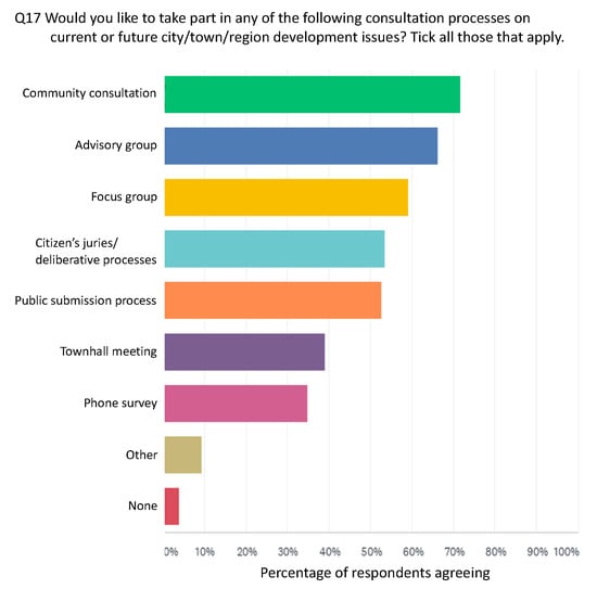 Other citizen surveys have been conducted on related urban issues in Australia. For example, Chambers et al. [27] discuss Australian political scenarios. Stone et al. [56] surveyed Australians’ housing aspirations. Internationally, a range of studies have used citizen surveys [16,19,20,22,23,24,25,33,57]. However, few have attempted to elicit individual citizen’s views on such a broad range of urban transformation issues.