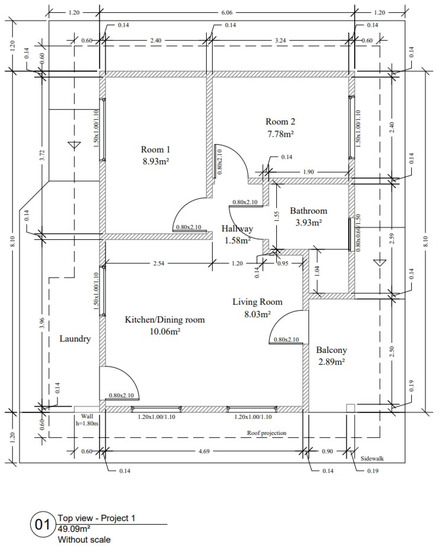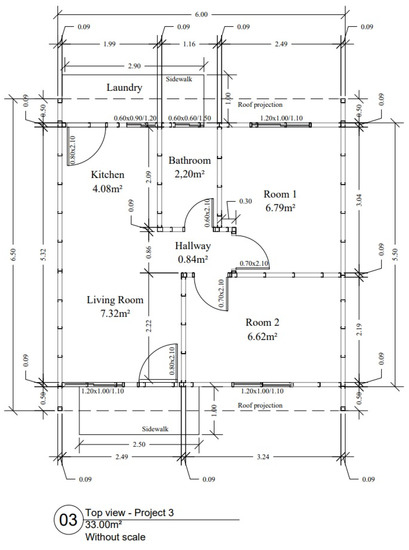 In this study, three housing projects with different construction typologies, obtained from public agencies and designers, were selected. These typologies represent the vast majority of low-income housing in Brazil. Project 1 was a reinforced concrete structure with hollow ceramic bricks walls: a predominant feature in the country′s housing construction (Figure 1). Project 2 was had structural masonry construction (Figure 2), and Project 3 was the Light Steel Frame (LSF) building with cement and gypsum board walls (Figure 3). All projects included a living room, two bedrooms, dining room, kitchen, bathroom, service area, and circulation areas. Because the areas vary from 33.00 to 49.09 m2, one square meter of construction was considered as functional unit to ensure equivalent comparability of results. It was assumed that all the projected dwellings met the function of protecting and providing minimum comfort for families of up to four people [40].