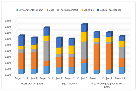Considering the weighted weights, relative to all respondents, the evaluations of each alternative in relation to the criteria considered were obtained. The results are presented in Table 8, including the final values for each project, with the best values highlighted in bold. It can be observed that, despite the significantly higher cost of Project 3, this alternative was the one that obtained the best final score (0.3817), followed by the conventional project. Similar analyses were performed considering the opinions of the designers and users separately. Despite divergences in the importance of the criteria, as shown in Table 7, the final classification of the alternatives was maintained.