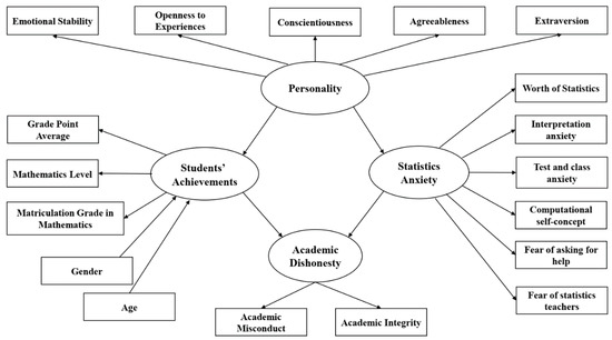 The research model presents personality (measured by Extraversion, Agreeableness, Conscientiousness, Openness to Experience, and Emotional Stability), with a mediation of the latent variable of statistics anxiety (measured by worth of Statistics, interpretation anxiety, test and class anxiety, computational self-concept, fear of asking for help, and fear of statistics teachers) and of the latent variable of students’ achievements (measured by mathematics level, grade point average and matriculation grade in mathematics) as the factors assumed to influence academic dishonesty).