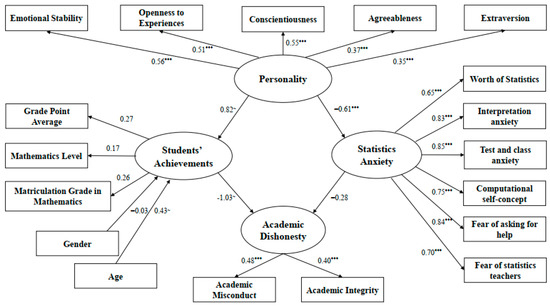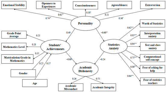 The Academic Dishonesty variable has been modelled according to the variables of Academic Misconduct and Academic Integrity, as well as by the latent variable of Personality Traits (measured by Extraversion, Agreeableness, Conscientiousness, Openness to Experiences and Emotional Stability), mediated by the latent variables of (1) Statistics Anxiety (which itself measured Worth of Statistics, Interpretation anxiety, Test and class anxiety, Computational self-concept, Fear of asking for help, Fear of statistics teachers) and (2) Students’ Achievements (which measured the Mathematics Level, Grade Point Average and Matriculation Grade in Mathematics). Data fit the Academic Dishonesty model marginally well (χ2 = 725.032, N = 316, df = 262, p < 0.001, CFI = 0.745, RMSEA = 0.075).