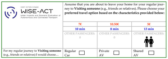 Total travel cost included all vehicle costs (e.g., fuel, insurance, maintenance, parking). Figure 1 illustrates a sample scenario shown in the variant of the survey for Cypriot respondents.