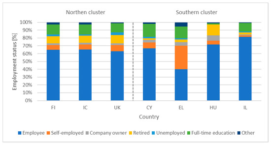 The sample forms a unique dataset regarding geographical and cultural coverage that has not been analysed before. Figure 3, Figure 4, Figure 5 and Figure 6 and Table 2 and Table 3 show the socio-economic characteristics of the sample, in terms of age (Table 2) and gender (Figure 3), household size (Figure 4), car ownership (Table 3), level of education (Figure 5) and employment status (Figure 6). The data is presented alphabetically and divided into northern and southern cluster groups. Concerning age and gender, we can observe a prevalence of men, and mean age above 38 across all the countries. When compared to statistical data about drivers in the countries the study was conducted in, we can find the prevalence of men in the driving population (license holders) (for example, UK [69], IL [70]), however the differences are not too large. There is an obvious negative relationship between the mean age of the sample and the percentage of women – higher the mean age, lower the number of women participants. The lowest percentage of women and the oldest age were found in Hungary while the highest percentage of women and youngest age was in Cyprus. This limits the generalisability of the findings for gender for the older respondents, although in this case, the dataset provides more information about male preferences and attitudes towards AV and SAV usage. The median age in Europe is 43, with Cyprus having the lowest median of only 37.3 in 2018 [71], which is, except for Hungary, similar to the results collected in the survey. In Israel, the median age was 30.5 in 2020, which is lower than the average of the sample, given Israel is the youngest country with the largest number of children per household [72]. The results showed that the largest households were reported in Finland and Iceland, which on the other hand also reported the smallest mean number of cars per household. The lowest number of cars was found for Israel, where there is also the smallest reported number of cars per household in the census.