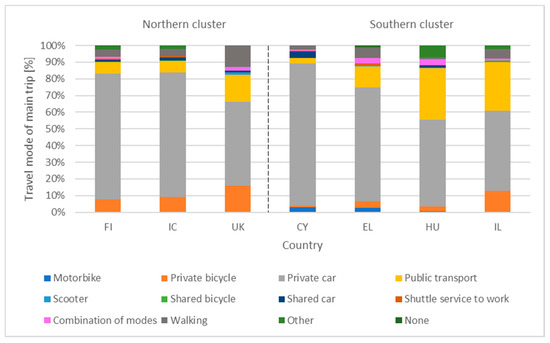 Figure 7 and Figure 8 present, respectively, the mode and purpose of the main trip made by respondents. Cars were the predominant mode, justifying the survey design around a regular respondent car journey, followed by public transport and use of personal bicycles. However, although the car was reported as the most common mode for main trips in all countries, there are significant differences among their share, with 50% or less in Hungary, Israel and UK, and more than 85% in Cyprus. The main trip purpose is to commute and then, much less, to go shopping. These results are comparable among all the countries in the survey and are also in line with the general findings for an average EU citizen [74].