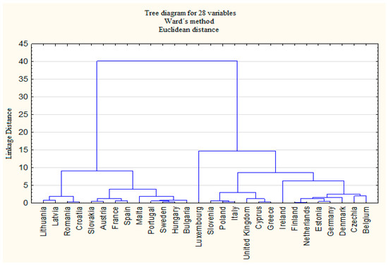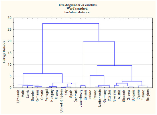 After a repeated cluster analysis for data from 2017, greater convergence of individual clusters can be observed. The total distance between the linkage in this case decreases to 28 (it amounted to 40 in 2000). Individual country clusters also demonstrate minute differences and are generally converging. Figure 6 illustrates individual clusters referring to five groups in total. The first comprises Lithuania, Malta, Latvia, Sweden, Romania, and Croatia. The second larger group consists of Portugal, Hungary, France, the United Kingdom, Italy, Spain, and Denmark. The following group includes Poland, The Netherlands, Germany, and Czechia, and implies similarity in terms of the countries’ industrial burden. The penultimate cluster is comprised of Slovakia, Austria, Slovenia, Greece, Bulgaria, Cyprus, Finland, and Belgium. Luxembourg and Estonia also demonstrate similar contributions of emissions from individual groups, although simultaneously they engage in the system last with the total distance of the linkage equalling 20.