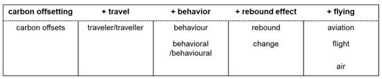 The conceptual framework developed in this paper was based on a review of relevant literature. Keywords were defined and used to search the Scopus database and the Web of Science citation index. A main search term was selected, namely “carbon offsetting travel behavior rebound effect flying”, and synonyms or similar terms were identified for each keyword in this search term. Figure 1 shows the keywords used. During the literature review process, various combinations and parts of these keywords were used. Conference papers and articles published before 2000 were excluded. Results were sorted by relevance, and the first 50 articles (note that several queries yielded many fewer than 50 results) were used to categorize the purchase motives (Section 3) and as references in the discussion on the impact of VCO on travel behavior (Section 4).