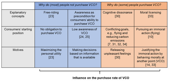 Furthermore, VCO may be seen as a moral licensing strategy. Moral licensing describes the effect that behaving in a morally good way at some point may lead to and justify behaving immorally at another point [33]. In this way, Kotchen [10] argues that purchasing VCO (= morally good behavior) might “offset the green guilt” of customers, giving them permission to use the airplane (= immoral behavior). For this reason, VCO have been compared with the medieval sale of indulgences [8], which enabled sinners to offset their immoral behavior by paying fees to church authorities. The importance of considering moral licensing with regard to VCO is stressed particularly by Dorner’s [14] argument, which states that the effect of moral licensing is largest when people hold pro-environmental attitudes. Other researchers have argued that business travelers are less likely to purchase VCO than individual travelers [27], possibly because business travelers do not consider themselves personally responsible for their flight emissions but see them as “necessary emissions” required by their businesses and employers. Therefore, moral licensing might be triggered less often for business travels. Figure 2 gives an overview of the most prominent behavioral reasons that explain the success or lack of success of VCO.