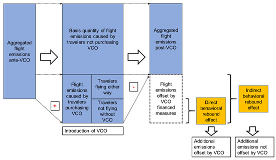 The impact and rebound effect of the introduction of voluntary carbon offsets (VCO) on flight emissions caused by air travelers (parts of this figure have been inspired by the classification of rebound effects of Dütschke et al. [18]).