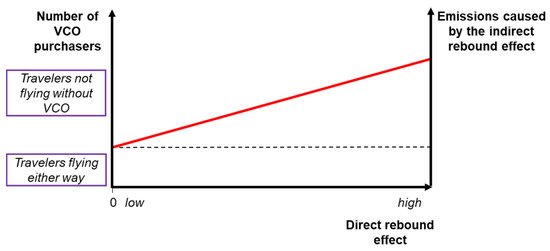 Setting these constraints aside, the direct rebound effect describes the increase in air travelers. Thus, it only concerns the subgroup of VCO purchasers who will not fly without VCO. The indirect rebound effect, on the other hand, may concern all VCO purchasers, because their purchase of VCO might morally license their carbon-intense behavior in any case.