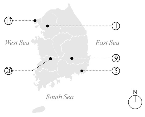 In this chapter, five of the 20 cases including one representative case for each city are investigated in detail: ① Daelim-Changgo in Seoul, ⑤ Terarosa in Busan, ⑨ Billy Works in Daegu, ⑬ Joyang-Bangjik in Inchon, and ⑳ Migok Storage in Jeollabuk-do (Figure 1). We selected them because they are the most active in each city and possess the above-mentioned characteristics of a regenerative cafe. These five cases will be examined in terms of the characteristics of location, architectural space, and the consumers’ use of the space.