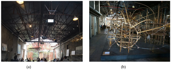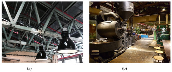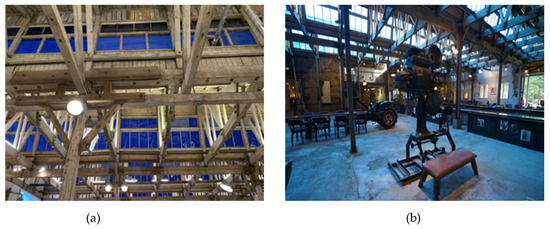 The regenerative cafe has a site area of 6990 m2 and comprises the factory and an attached building. The building used as cafe is a single-floor space, but some parts have a two-story structure. Including the height of the inclined skylight, the factory is a two-story-scale factory building with a gross floor area of 661 m2 [23]. The outdoor space and attached buildings are used as facilities for exhibitions and themed spaces connected with the café (Figure 3a). The factory building used for the cafe maintained the exposed ceiling for lighting, and the internal wooden triangular truss structure (Figure 3b).