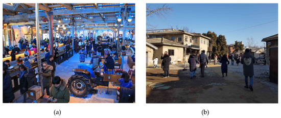The traces of the existing factory building were maintained to the utmost level in case of the exterior walls, except for open windows installed in some parts (Figure 4a). Furthermore, the inner walls were made of cement mortar and bricks, and the concrete floor inside the building has been left with no repair to emphasize temporality. Except for the existing window frames, most interior props, including a cultivator, tractor, wooden horses, mannequin, and projector, have been collected and arranged by the building owner. Various old items that do not seem to harmonize well with one another are utilized to maximize the sense of an extraordinary but emotional space (Figure 4b).