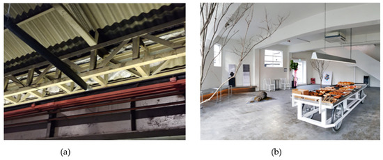 As the cafe has an 874 m2 courtyard, the indoor space enjoys sufficient natural light, and this courtyard serves as a transitional space for communicating with nature. Moreover, the existing exterior outline has been sufficiently maintained using the expanded metallic material, and wires are used as an interior element to highlight the memory of the old factory while maintaining the existing steel triangular truss structure and columns [26] (Figure 16).