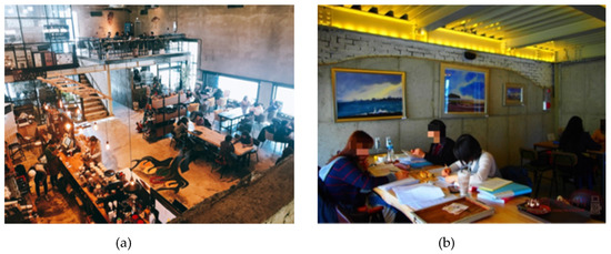 This cafe utilizes paintings by various artists as interior props and emphasizes emotional functions as a cultural space by using the gray wall of a single space as a screen (Figure 20b). This regenerative cafe has some external spaces, but the main focus is on the internal space. In terms of accessibility, it is far away from the city center, so public transportation is inconvenient. Hence, it is more convenient to come by car via the national road, and there is a separate parking lot.