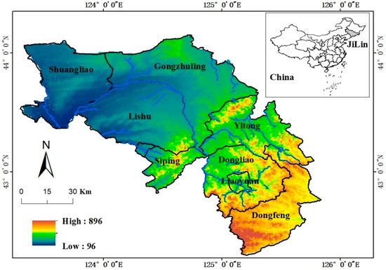 The Dongliao River originates from Liaoheyuan Town, Dongliao County, Jilin Province, China, and flows through Liaoyuan, Dongfeng, Dongliao, Yitong, Lishu, Gongzhuling, Shuangliao and Siping, Jilin Province (Figure 1). The Dongliao River Basin covers an area of 11,306 km2, which is mainly cultivated land and forest land. The Dongliao River Basin is an important commodity grain production base in China, mainly planting corn, soybeans, rice, etc. It is also a highly densely populated area in Jilin Province. In the period of rapid socioeconomic development in the 20th century, the area has experienced serious water pollution, reduced resource and environmental capacity, shrinkage of wetlands and forests, soil erosion, unreasonable resource allocation, and backward ecological environment management models which, in turn, have restricted the economic growth of the region due to natural and human irrational activities. As a key river basin in Jilin Province and even the whole country, the Dongliao River Basin has been regarded as a demonstration area for ecological restoration since 2007. At present, the pollution situation in the area has been preliminarily controlled and scientifically treated.
