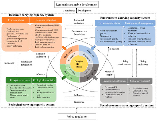 Therefore, the objectives of this study were (1) to construct an evaluation index system of comprehensive carrying capacity in the Dongliao River Basin by coupling resources, environment, ecology, and socioeconomics; (2) to analyze the spatial distribution of comprehensive carrying capacity, production–living–ecological space and ecological redline; (3) to reveal the coupling and coordination relationship between comprehensive carrying capacity, production–living–ecological space and ecological redline; and (4) to discuss the current situation of green development under the “multi-dimensions” integration system and provide policy suggestions.