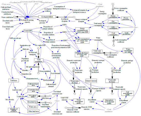 System dynamics (SD) is a discipline that analyzes and simulates dynamic complex systems. It is an extremely effective tool and simulation method for understanding and dealing with high-order, nonlinear, and multi-feedback time-varying systems. The research objects of SD are mainly open, nonlinear, high-level, multivariable, multi-feedback, complex, and time-varying systems. The research purpose of SD is to select the leading factors affecting the development of the system by analyzing the causal feedback relationship in the system and the influence of many factors on the system objectives and, finally, to provide a scientific decision-making basis for decision-makers. Therefore, the SD model is highly applicable to an integrated system of resources, environment, ecology, and social economy, which pursues the best goal of the whole system dynamics and emphasizes the coordinated development of each subsystem.