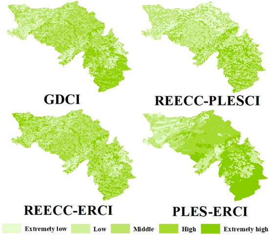 From a spatial point of view (Figure 8), the coupling degree of green development includes five types: extremely low coupling stage, low coupling stage, middle coupling stage, high coupling stage, and extremely high coupling stage. The degree of coupling coordination includes moderate balance, balance, basic coordination, and moderate coordination. During the study period, the coupling degree and coupling coordination degree of green development showed the spatial distribution characteristics of “large-scale high-value distribution area–multipoint median distribution area–small-scale low-value continuous area”. More than 80% of the regions have a high coupling and coupling coordination state. This indicates that REECC, PLES, and ER have mutual driving effects.