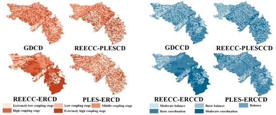 The spatial distribution of coupling degree and coupling coordination degree.