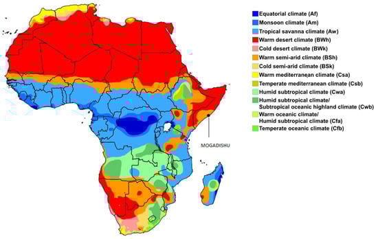 This section presents the analysis of the climatic context of Mogadishu. The city is situated close to the equator, and the prevailing climate of the area according to the Köppen–Geiger climate classification system is BSh (hot semi-arid climate), as shown in