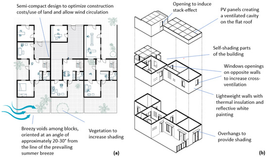 Improving ventilation is possible by locating the buildings according to a staggered pattern, in which each building should be oriented at an angle of about 20–30° concerning the prevailing wind direction. Furthermore, the distance between the opposite facades, that is, the depth of the building, should be limited, with large openings on the opposite external walls and with the rooms arranged in a row. Vegetation is also important and should be arranged to provide shade without interfering with natural ventilation.