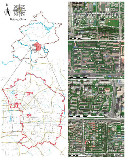 Urban residential areas, featuring highly heterogeneous internal environments and complex underlying surface patterns, which could be considered as “miniatures” of urban environments, are highly suitable for local and micro-scale studies. In this study, Wangjinghuayuan (WJHY; 40°0′ N, 116°28′ E), Xiuyuan (XY; 39°59′ N, 116°24′ E), Shuiduizi (SDZ; 39°55′ N, 116°28′ E) and Hepingjiayuan (HPJY; 39°57′ N, 116°25′ E) residential areas were selected for field monitoring (Figure 1). These four residential areas are evenly distributed in the northwest Chaoyang District of Beijing, with an average separation distance of 6.58 km and no large green spaces around them. Their surrounding streets enclose them as internally isolated spaces with typically flat interior terrain. The vegetation coverage in all residential areas is around 40%–60%. Descriptions of these four residential areas are given in Table 1.