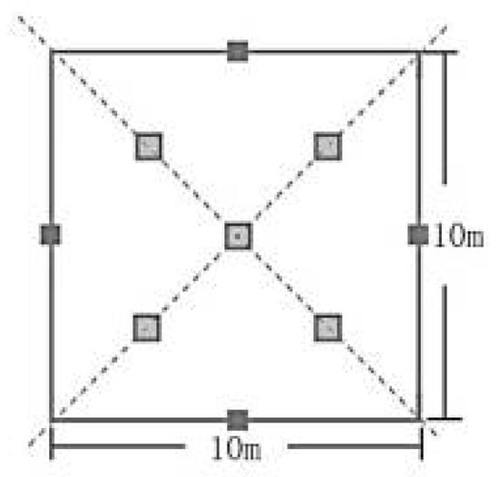 In this study, plant compositions of selected plots were recorded during preinvestigation and classified into eight community types as described above. To measure canopy characteristics, CD, canopy porosity (CP), LAI and sky view factor (SVF) were selected to define the community canopy in horizontal, vertical and overall leaf volume dimensions, respectively. Within each community, five measuring points were set at the positions shown in Figure 2. All canopy measurements were conducted on a cloudy day (without strong direct solar radiation) at a 1.5 m-height above each measuring point. The mean of these five measuring points was used to represent the CD, CP, LAI and SVF values of each community.