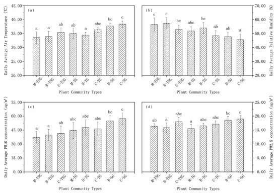PM concentrations shown in Figure 4c reveal that the M-TSG community had the lowest daily average PM10 concentration (dPM10), with a value of merely (37.31 ± 5.98) µg/m3, followed by the (39.67 ± 6.16) µg/m3 B-TSG. The (57.33 ± 6.11) µg/m3 C-SG community featured the highest concentration. The daily average dPM10 of these eight plant community types ranked as follows: M-TSG < B-TSG < C-TSG < M-TG < C-TG < B-TG < B-SG < C-SG, with a range of 20.02 µg/m3 and significant differences among different plant community types (p = 0.035). As for daily average PM2.5 levels (dPM2.5) shown in Figure 4d, the difference among all eight plant community types was also significant (p = 0.042). M-TSG had the lowest concentration, with dPM2.5 of (15.52 ± 1.55) µg/m3, followed by (15.84 ± 1.69) µg/m3 B-TSG. (18.57 ± 1.36) µg/m3 B-SG and (18.95 ± 1.22) µg/m3 C-SG featured significantly higher concentrations than others, while the difference in extreme values was 3.43 µg/m3.