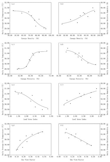 Non-linear fitting relationship between: (a) canopy density and daily average AT; (b) canopy density and daily average RH; (c) canopy porosity and daily average AT; (d) canopy porosity and daily average RH; (e) leaf area index and daily average AT; (f) leaf area index and daily average RH; (g) sky view factor and daily average AT; (h) sky view factor and daily average RH.