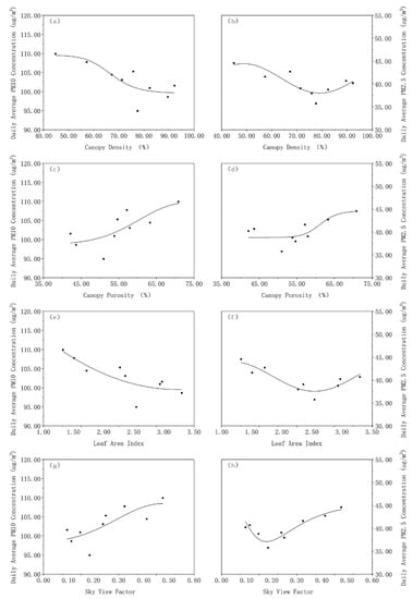 Non-linear fitting relationship between: (a) canopy density and daily average PM10; (b) canopy density and daily average PM2.5; (c) canopy porosity and daily average PM10; (d) canopy porosity and daily average PM2.5; (e) leaf area index and daily average PM10; (f) leaf area index and daily average PM2.5; (g) sky view factor and daily average PM10; (h) sky view factor and daily average PM2.5.