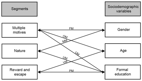 According to the Figure 3, the three presented segments were significantly related to the variables gender, age, and educational level. However, the three segments did not present a significant relationship (p < 0.05) with the origin variable (national and foreign tourists), nor with the professional activity. The “Multiple motives” segment was mostly female, older, and with university studies. On the other hand, the “Nature” segment was mostly male and with university studies. While those of “Reward and escape” were mostly young and with postgraduate studies.