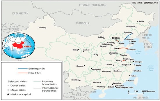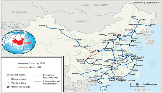 Growth of China’s high-speed rail network in the year 2018 (https://elibrary.worldbank.org/doi/pdf/10.1596/978-1-4648-1425-9, accessed on 23 April 2021).