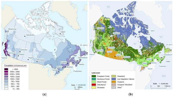 Canada is geographically the second-largest country in the world, expanding over 9.98 million km2. Its substantial area is, however, occupied by freshwater, i.e., 0.89 million km2. Situated on the North American continent, Canada is located between latitude 42° to 83° N and longitude 53° to 141° W. The country is bordered by the Atlantic Ocean in the east and the Pacific Ocean in the west [1,2,3]. Canada is a vast country, as wide as it is long, with the longest coastline (202,080 km), yet it has the lowest population density of 3.8 persons/km2. Hydrological diversity prevails, including precipitation and land use across 10 provinces in Canada, as shown in Figure 1 [2].
