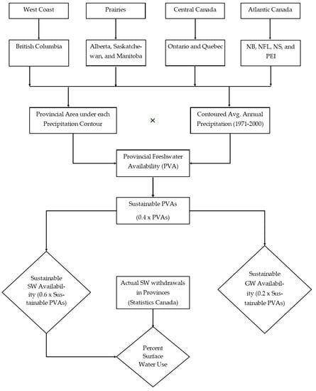 Delineation of climate change impacts was segregated into temperature, precipitation patterns, streamflow patterns, and appropriate irrigation strategies thereof. The analysis was spatially segregated into the West Coast (British Columbia), Prairies (Alberta, Saskatchewan, and Manitoba), Central Canada (Ontario and Quebec), and Atlantic Canada (Nova Scotia, New Brunswick, Prince Edward Island, Newfoundland, and Labrador) on a broader scale. However, provincial results were also included. Freshwater availability in provinces was calculated from their weighted average annual precipitations for the latest climate norm available, i.e., 1971–2000, as shown in Figure 1a to serve as benchmarks. Hydrological variations that occurred thereafter have been presented and discussed region-wise. Contoured precipitations within provincial boundaries were multiplied with their respective areas and added together to estimate freshwater availabilities. Sustainable availability/withdrawals were taken as 40% of the total water availability as an established norm. Rational techniques were used to approximate surface water and groundwater as 60% and 20% of sustainable water availability in each province, which in turn, were counterchecked from publications. A flow chart of the input data, steps, and assumptions for computation of sustainable surface water availability, withdrawals, and percent surface water use is given in Figure 2.