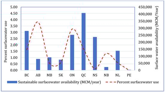 The changing precipitation patterns in Canada would have impacted the streamflow patterns, as those are directly related. Around the world number of perennial streams have been converted into ephemeral waterways along with several other changes in hydrological dynamics and water cycle [45,46]. In Canada, the gross area of drainage basins is hydrological divides; however, the effective drainage area is what contributes to streamflow every year or every other year [47]. There are 25 drainage basins in Canada with present surface water withdrawal for all kinds of uses in all the provinces far below the sustainable limits of 40%, as depicted in Figure 5. Sustainable surface water availabilities (in million cubic meters per year) were computed from weighted average precipitation for each province of the latest climate normal, i.e., 1971–2000, as shown in Figure 1a as explained in the Materials and Methods section (Figure 2). Surface water uses were computed from Statistics Canada data and provincial surface and groundwater dependencies [5].