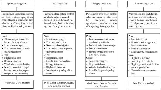 Provision of supplemental irrigation by the least efficient surface irrigation is not a good idea. This is even though the availability of water is mostly not a limitation in most of the regions in Canada. Drip irrigation systems for orchards and sprinkler or floppy irrigation systems for high-value crops are recommended. An increase in production is likely to outweigh costs as supplemental irrigation not only increases yield but also stabilizes production. The International Centre for Research in Dry Areas (ICARDA) found a 30–400% increase in wheat yields by providing supplemental irrigation in Syria. Though yield increase by supplemental irrigation is significantly higher in dry areas, where moisture is the single most limitation for productivity [94], supplemental irrigation would substantially increase crops’ yields in Canada. This is a good adaptation to climate change in which rising temperatures are increasing crop water requirements and keeping up with the pace of rising food demands. A schematic of irrigation strategies with their benefits, performance, and weaknesses for different regions is given in Figure 6.